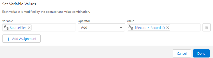 Source File Ids: select SourceFiles (created above) under Collection Variables