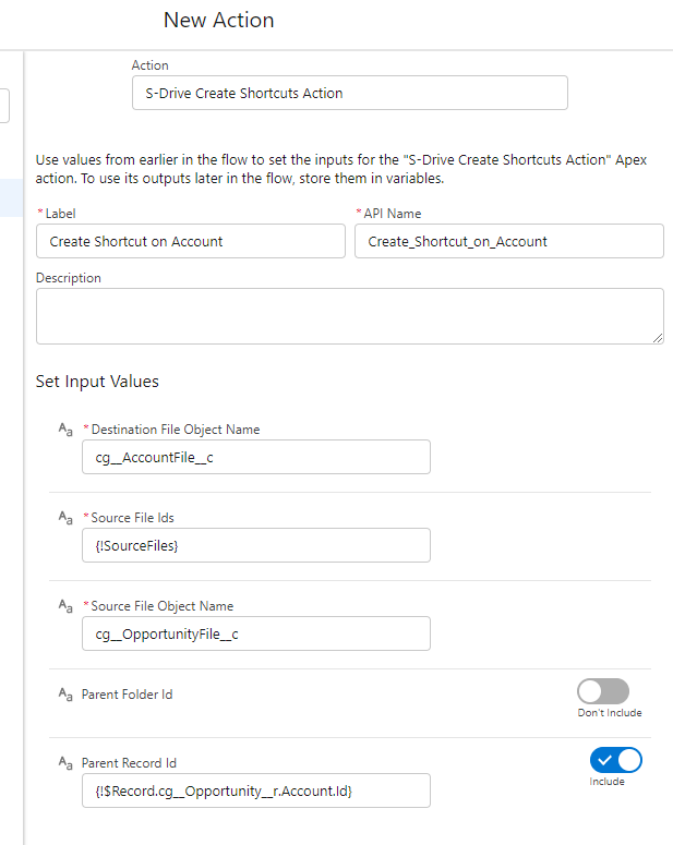 When creating Shortcuts in a Flow, you must use a collection variable to store the source file id, even if you’re just creating one shortcut. Use the Apex Action “S-Drive Create Shortcuts Action” to create the folders from the list of folder names.