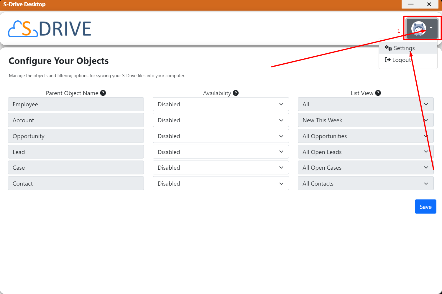 On the Configuration Page, you are shown the list of parent objects that have related S-Drive file objects.