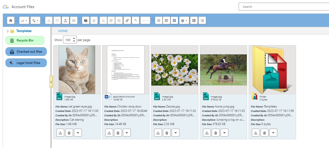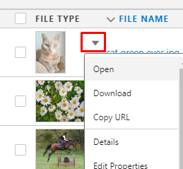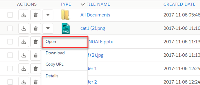 Back on the List View, the "Actions" column is used to display action buttons. The buttons shown here are based on configuration and profile permissions. There are two quick buttons for the most commonly used actions: Download & Delete. Clicking the down arrow button, shows a dropdown menu with more actions. Let's review the details about these item actions.