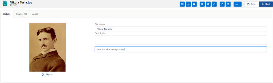On the Detail page there are different tabs to navigate, to view different kinds of information about the file. These three tabs are "Detail", "Chatter" and "Audit".