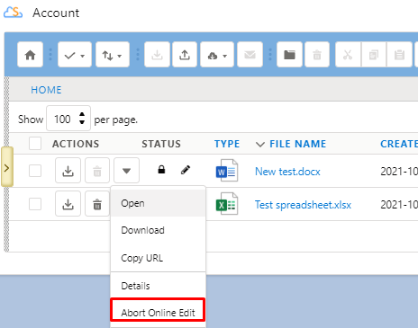 While the file is locked for editing, if anything goes wrong or you’d like to end the editing session without saving your changes, you can click the down-arrow on the Action menu and choose “Abort Online Edit.”