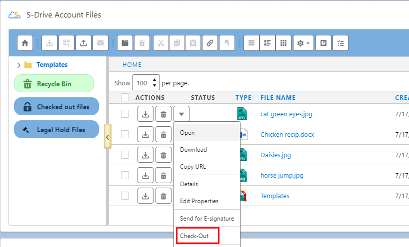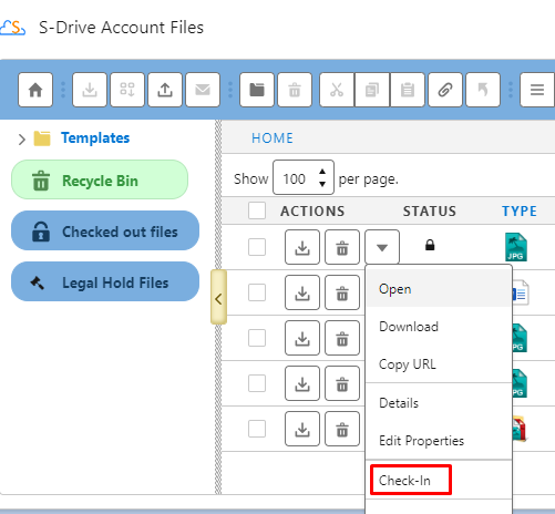 Custom Actions: You will see the custom actions that is built by your admin or developer in this section. Clicking on one of these actions will perform the custom action. See "Custom Actions" section in "S-Drive Admin Guide" for more information or contact your admin if you have questions on the custom actions that is built for your organization.