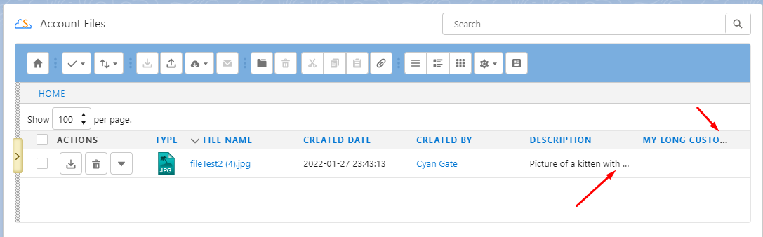 CODE[ { "fileObjectName":"cg__AccountFile__c", "fieldList":[ { "fieldName":"cg__File_Name__c", "wrapEnabled": true, "columnWidth": 100 }, { "fieldName":"cg__Description__c", "wrapEnabled": true, "columnWidth": 200 }, { "fieldName":"CreatedDate", "wrapEnabled": true, "columnWidth": 100 }, { "fieldName":"LastModifiedDate", "wrapEnabled": true, "columnWidth": 100 }, { "fieldName":"My_Custom_Field_with_a_Long_Name__c", "wrapEnabled": true, "columnWidth": 100, "clickable" : true }, { "fieldName":"cg__Tags__c", "wrapEnabled": true, "columnWidth": 200 } ] } ]
