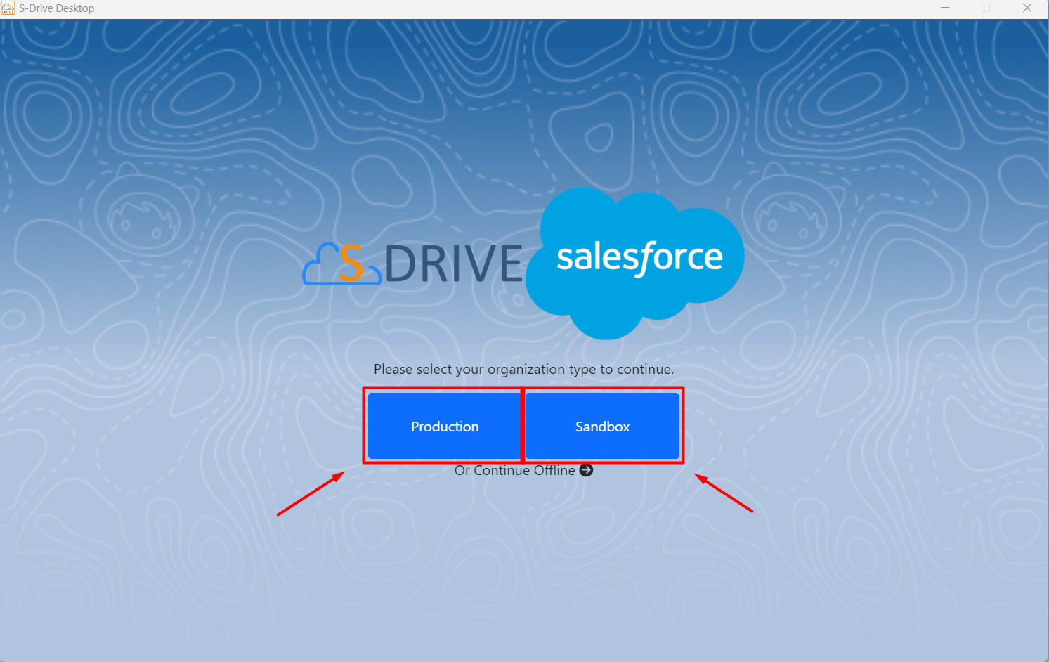 Click on Production or Sandbox according to which kind of org you’re using the Desktop Experience with.
