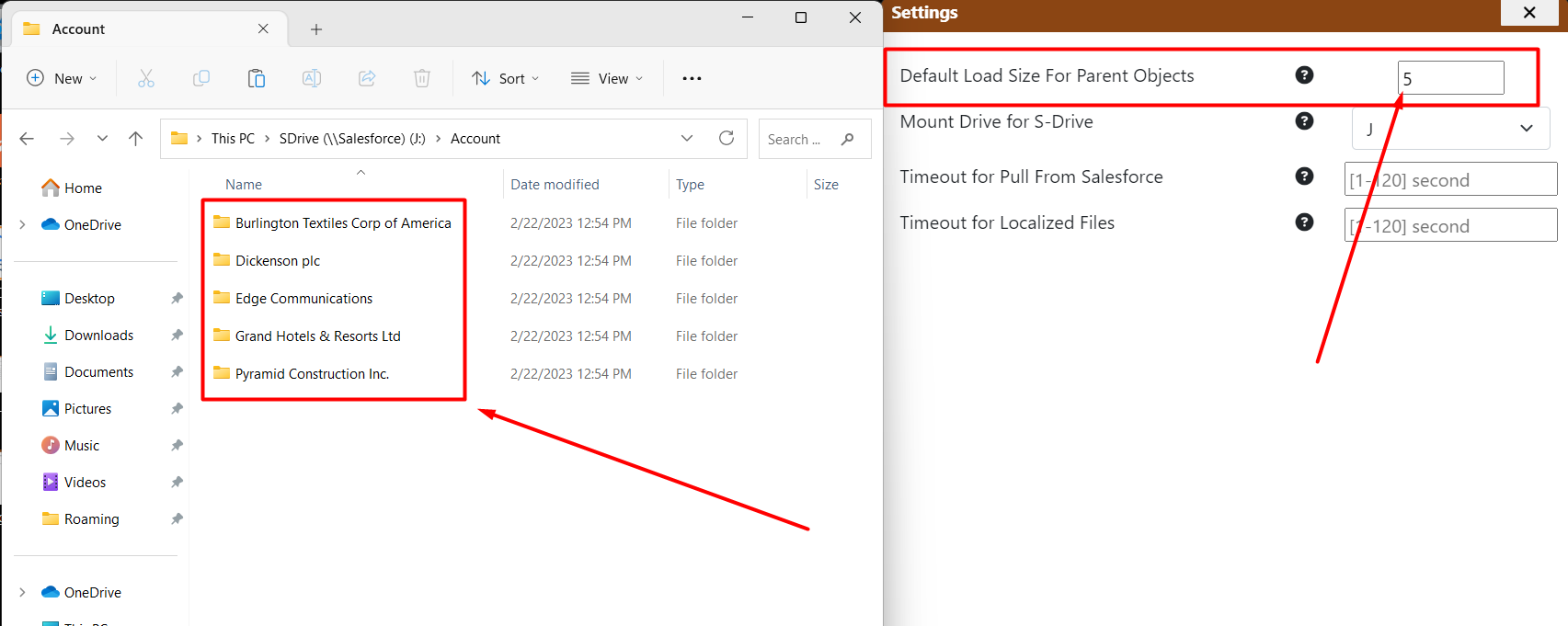 Default Load Size for Parent Object: (Default = 1000) The maximum number of Parent records that will be displayed on your Desktop Experience drive. For example, if there are 20 Account records in your selected List View (see Choose Records to Sync below) and this setting is set to 10, then only 5 Accounts will be shown.