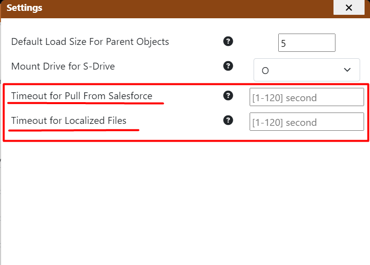 Timeout for Pull From Salesforce and Timeout for Localized Files: (Default = 30) Maximum wait time before the operation times out.