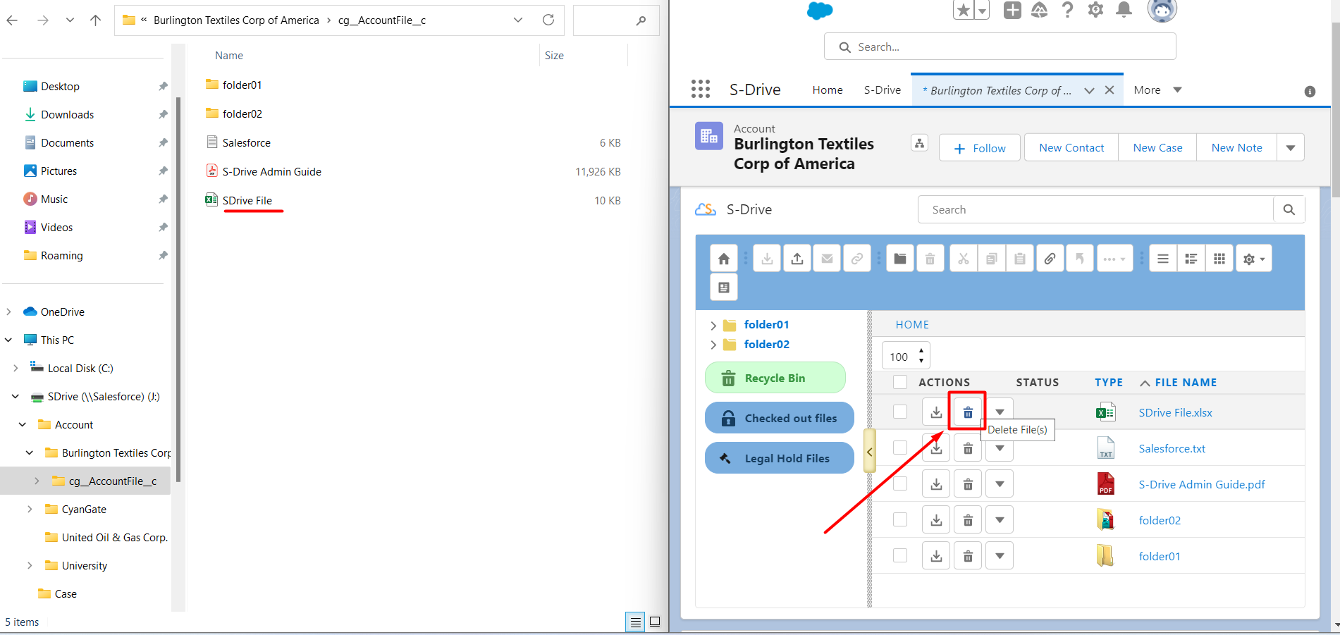 To delete a file, right-click on the file and select Delete. The file will be deleted from the view on the Desktop Experience. In Salesforce, the file will be moved to the S-Drive recycle bin.