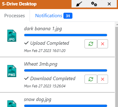 Processes show you uploads and downloads with a progress bar as they happen. Notifications show a success or failure message.