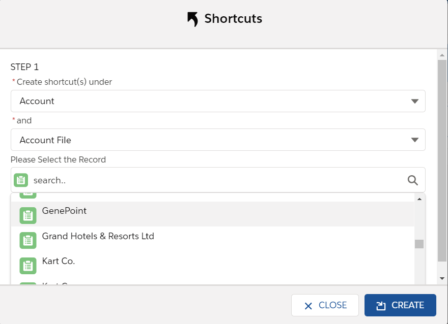 ![]() | Create Shortcuts | Allows you to create a shortcut of a file on another record. This allows you to see a file in more than one place. |