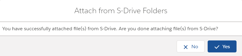 After completion of the attach process, you'll be asked: "You have successfully attached file(s) from S-Drive. Are you done attaching file(s) from S-Drive?" If you select "Yes", message will be closed, and you'll be redirected to the account page. "No" button will return you to Attach From S-Drive screen.