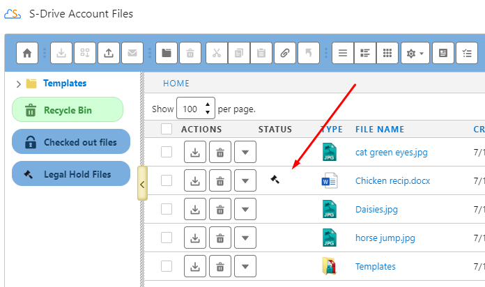 After clicking "Put Legal Hold", nothing changes for you as the user who put the file under legal hold. You can still modify the file, delete it, or upload a new version to it. You can see a small gavel icon under the STATUS column, indicating that the file is under legal hold.
