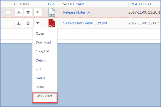 j. "Set Current:" You can set a version as the latest version by clicking "Item Actions" button under "Actions" column and selecting "Set Current" action menu item from dropdown for individual files in Versions screen. When you click Set Current, selected old version will be set as the latest version of the file.