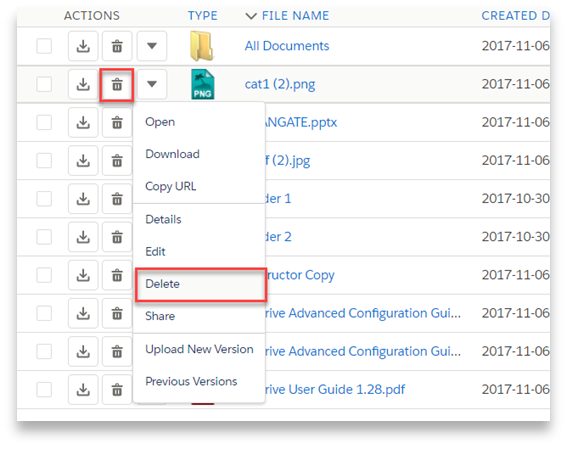 Back on the List View, the "Actions" column is used to display action buttons. The buttons shown here are based on configuration and profile permissions. There are two quick buttons for the most commonly used actions: Download & Delete. Clicking the down arrow button, shows a dropdown menu with more actions. Let's review the details about these item actions.