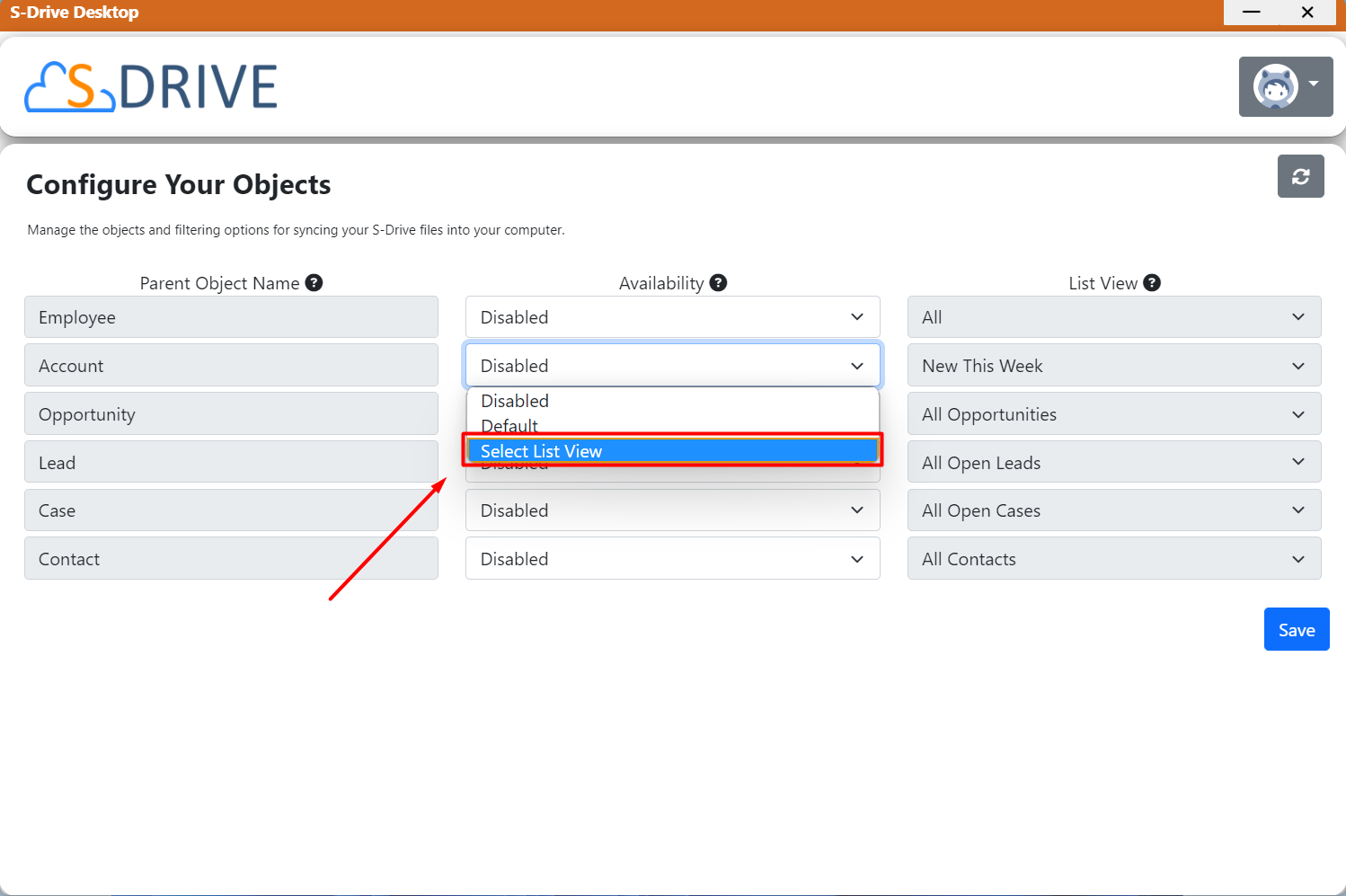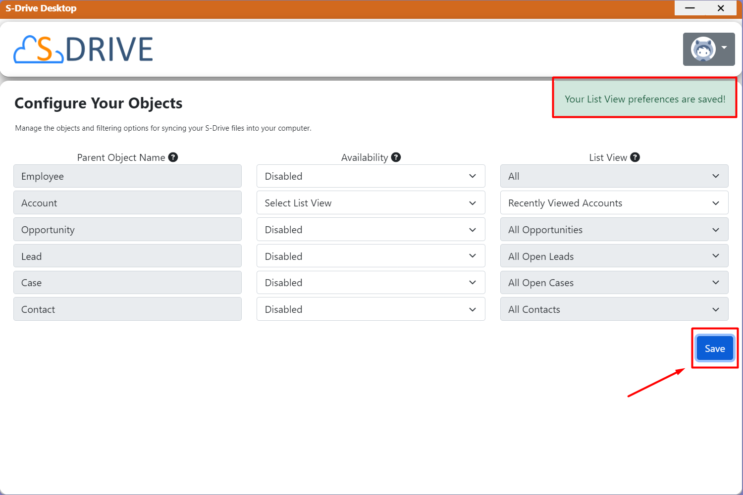 On the Configuration Page, you are shown the list of parent objects that have related S-Drive file objects.