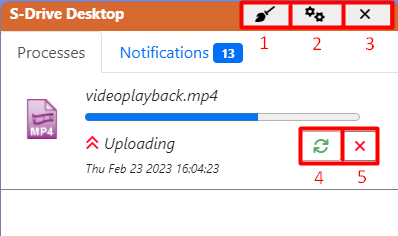 There are several buttons at the top as shown in the image below. 1) Clear Jobs: It will clear all the processes and all the notifications. 2) Open Configurations: It will open the Configure Your Objects page where you see all your objects. 3) Close: It will close Tray Window. 4) Retry: After canceling the upload process, you can re-upload with this button. 5) Cancel: You can cancel the uploading process.