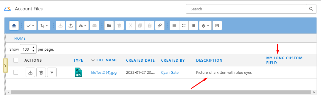 CODE[ { "fileObjectName":"cg__AccountFile__c", "fieldList":[ { "fieldName":"cg__File_Name__c", "wrapEnabled": true, "columnWidth": 100 }, { "fieldName":"cg__Description__c", "wrapEnabled": true, "columnWidth": 200 }, { "fieldName":"CreatedDate", "wrapEnabled": true, "columnWidth": 100 }, { "fieldName":"LastModifiedDate", "wrapEnabled": true, "columnWidth": 100 }, { "fieldName":"My_Custom_Field_with_a_Long_Name__c", "wrapEnabled": true, "columnWidth": 100, "clickable" : true }, { "fieldName":"cg__Tags__c", "wrapEnabled": true, "columnWidth": 200 } ] } ]
