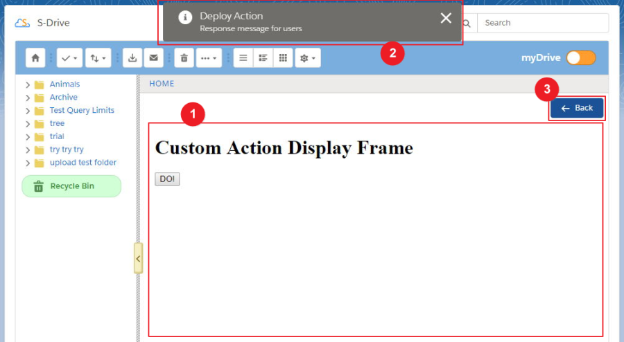 On this type of S-Actions, your VF Pages or Static Resources can be embedded to S-Drive Component as a hidden Iframe. This type of S-Actions is suit for running on background process without any feedback of users. For example, you want to upload selected files to your personal website by one click. After you write your apex code and VF page, just select files on the list and click your custom action on the toolbar. And it will work on background to complete process, after completed it will inform user by a toaster message.