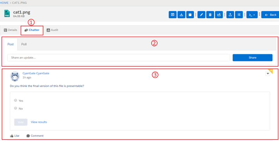 g. "Post to Chatter" is used to post comments/thoughts about a file to Salesforce Chatter. After clicking, a pop-up screen will appear, and you will be able to create a post or a poll, mention users, and share your thoughts about a file.