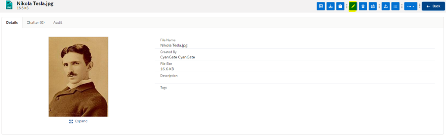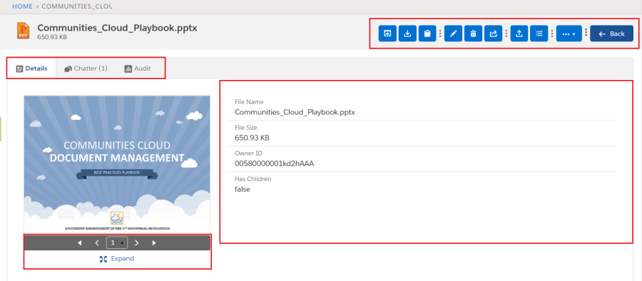 On the Detail page there are different tabs to navigate, to view different kinds of information about the file. These three tabs are "Detail", "Chatter" and "Audit".