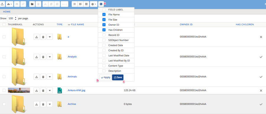 "Apply" button is for after selecting/deselecting the fields to rearrange file list table, to apply these changes to current view of file list (b).