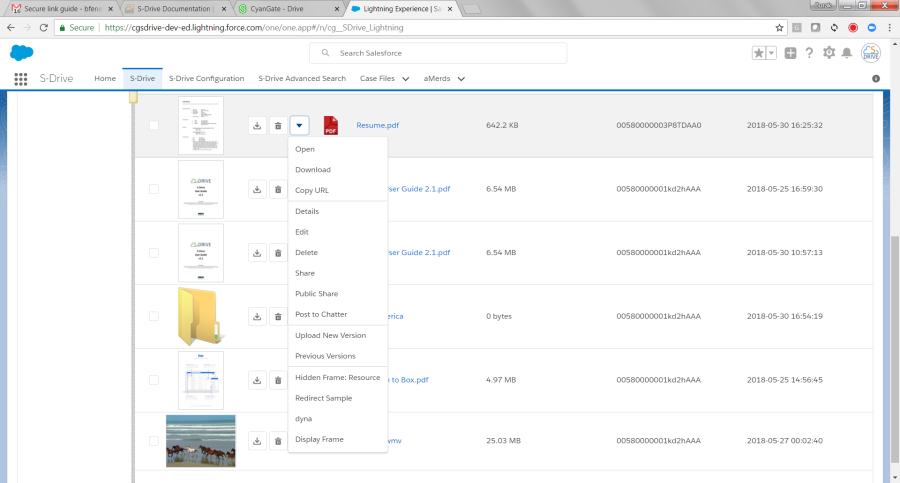 Back on the List View, the "Actions" column is used to display action buttons. The buttons shown here are based on configuration and profile permissions. There are two quick buttons for the most commonly used actions: Download & Delete. Clicking the down arrow button, shows a dropdown menu with more actions. Let's review the details about these item actions.