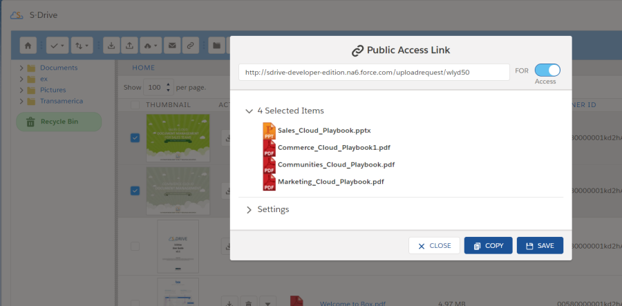 ![]() | Public Share | Create a secure link to files that can be sent to people outside of Salesforce |