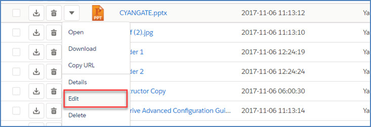 Post to Chatter: This option is displayed only for files. You can post your thoughts related to this file by clicking on this action menu item. See "Posting to Chatter" section for more information.