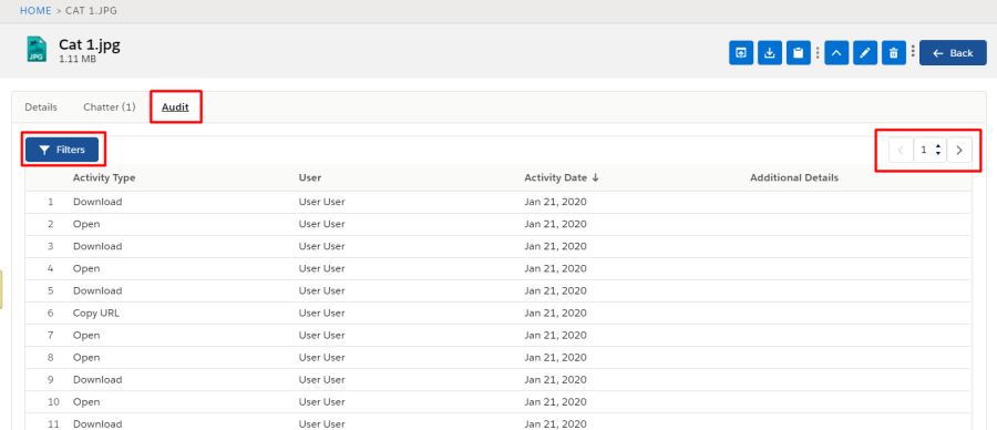 You can also navigate through pages using the pagination buttons at the right top corner. Each page has 20 file activity records.