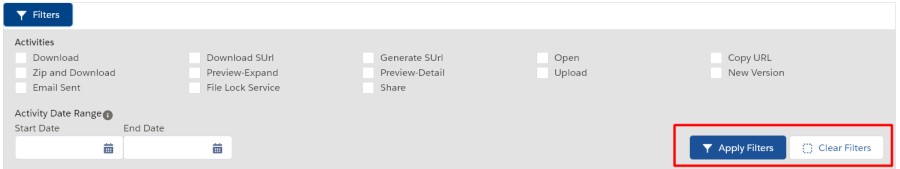 Here you can select the type of activities using the checkboxes, to change the displayed activities based on type. You can also apply a date range in order to see the activities recorded between specific dates. In order to apply filters, click on "Apply Filters" button. To clear all filters on checkboxes and dates, click on "Clear Filters" button. This way, all file activities will be listed in the table. You can click on "Filters" button to close the filters section.