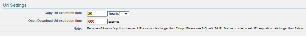 Open/Download Url expiration time This setting determines how long a link will last when a file is opened or downloaded. This is for added security, so that if users copy the url from their browser and share it, you can limit how long that link will work. The default is 600 seconds (5 minutes.)