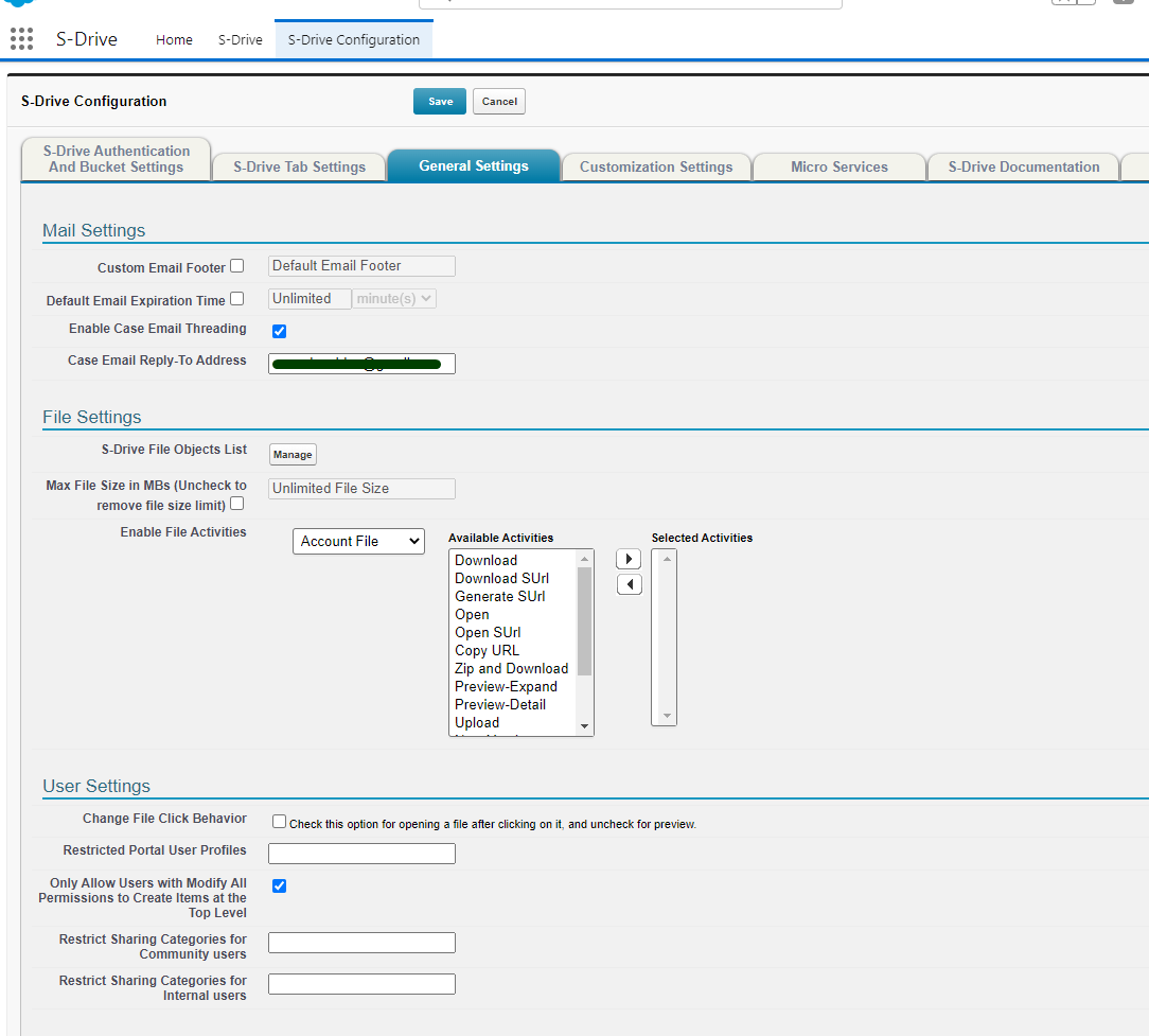 The dropdown list shows all object files for objects using S-Drive. (See Note below if your file object is not on the list.) Choose the object file to configure from the dropdown list. Then select the activities you want recorded by moving them from Available Activities to Selected Activities. Click Save at the top or bottom of the page, then repeat for other object files you wish to use File Activities on.