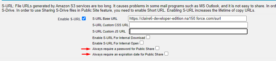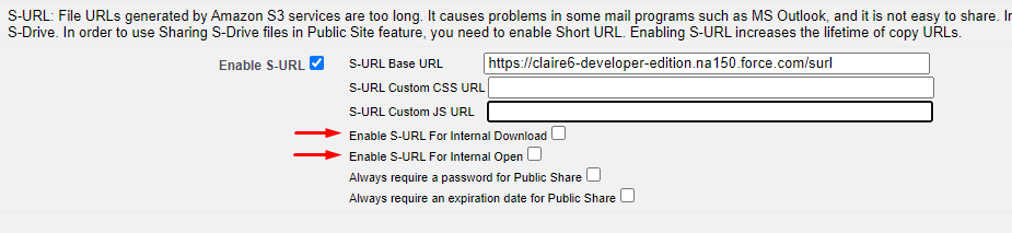 In S-Drive Configuration Micro Services Tab, choose whether to check “Enable S-URL for Internal Download” and “Enable S-URL for Internal Open.” These settings determine whether S-URL or Amazon AWS long URLs are used when a file is downloaded or opened by Salesforce users. If unchecked, S-URL will only be used for Public Share and Copy URL functionality. There is generally no reason to check these boxes. If they are checked and something changes with your S-URL configuration, you could have problems opening files internally.