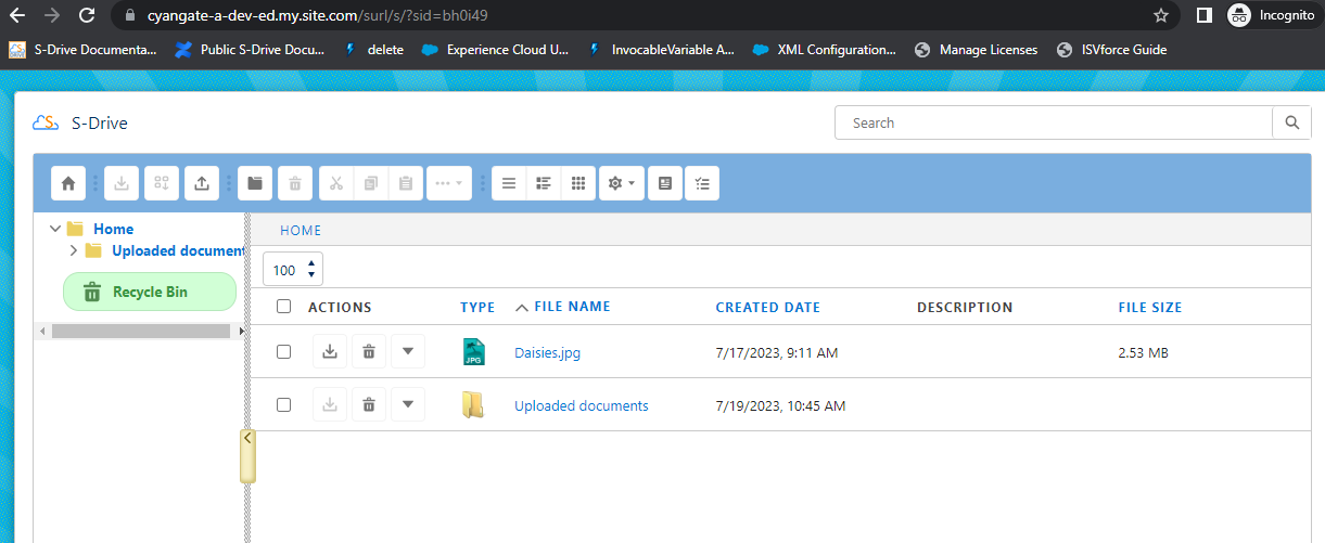 A S-URL link will be created, which you can share outside of Salesforce. The recipient will see the files in an S-Drive component. Uploads can be done into the provided folder.