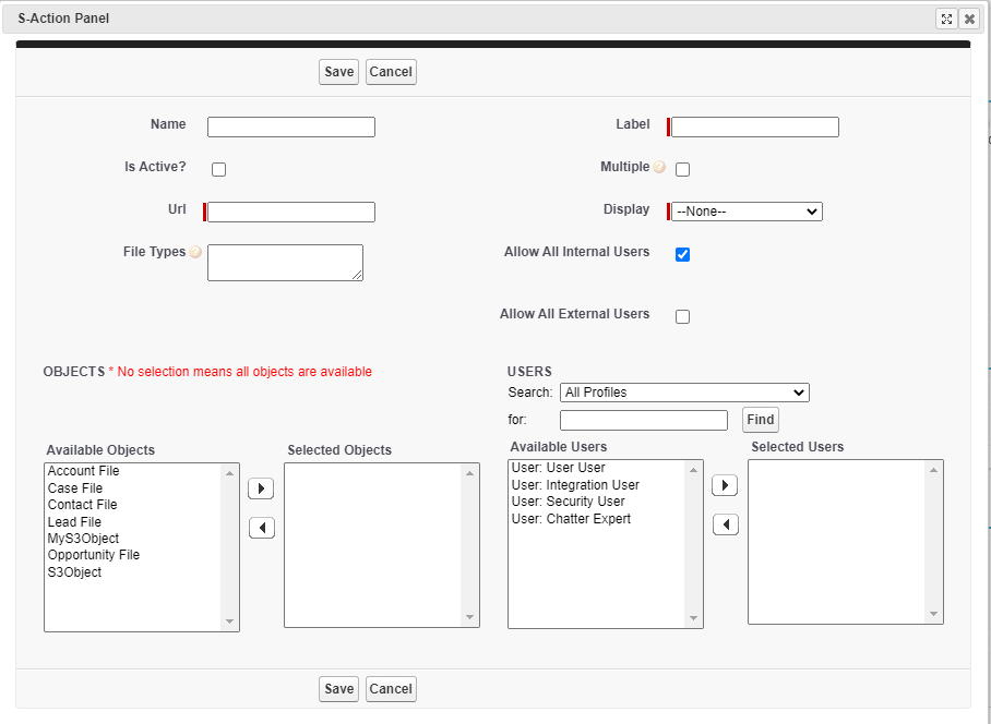 If you want to limit the users that can use the S-Action, you can leave the “Allow All Internal Users” and/or “Allow All External Users” checkboxes unchecked, and select specific users instead. Use the Search to search by profile and or user’s name, move your chosen users to the Selected Users list, and click Save. Users must also have profile permission for SDriveCustomAction.