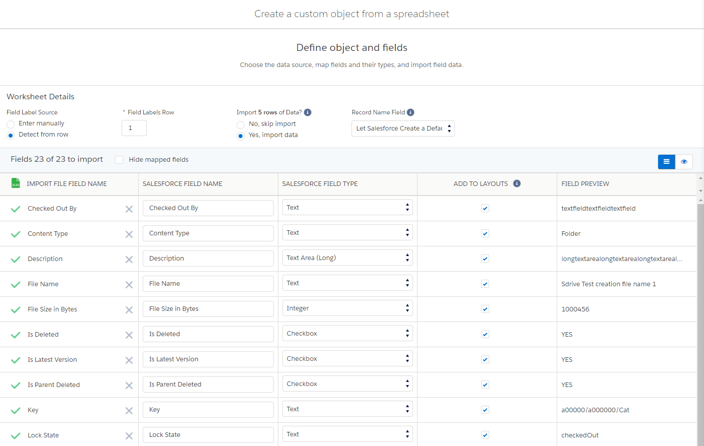 Instead of creating a custom object from scratch, and creating each custom field one-by-one, you can use a spreadsheet to create custom objects. This can be used for creating custom file objects for S-Drive.