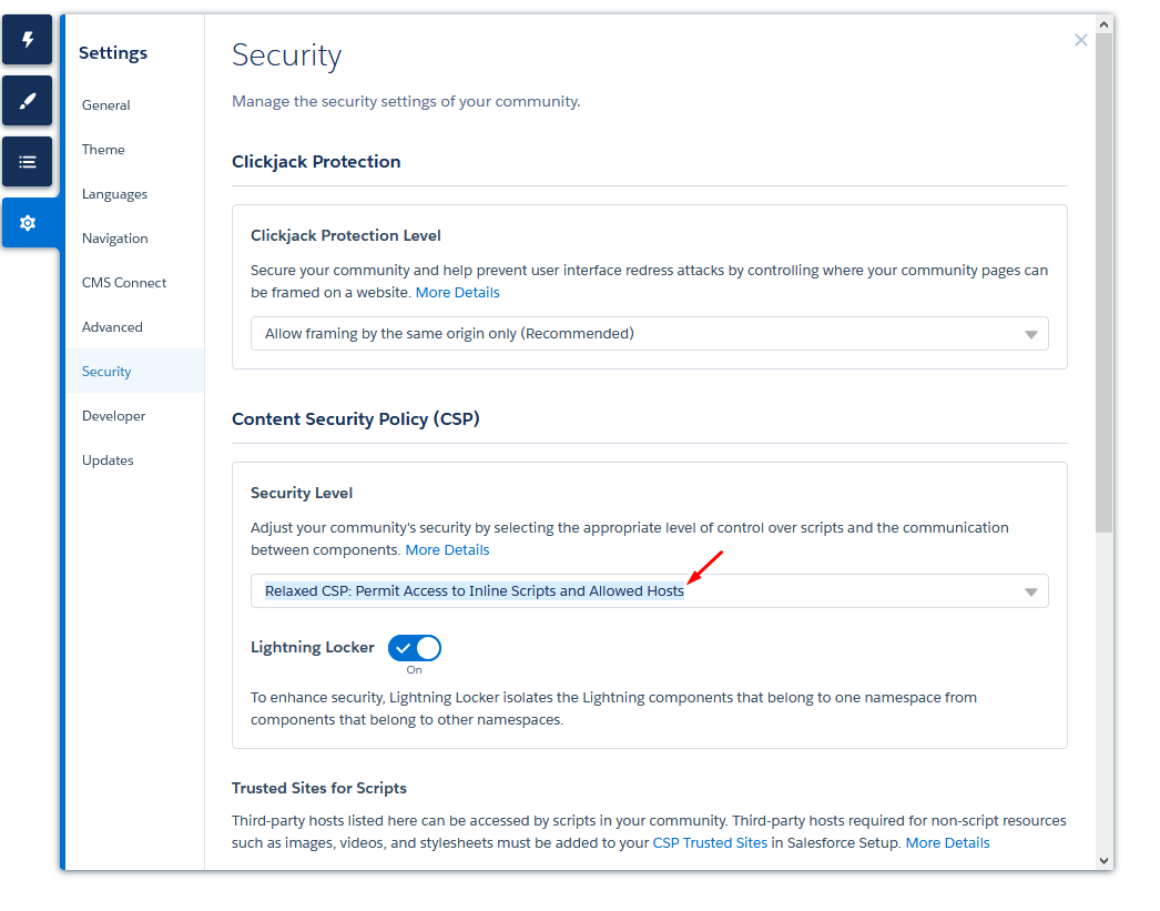 Make the Security Level as Relaxed CSP: Permit Access to Inline Scripts and Allowed Hosts.