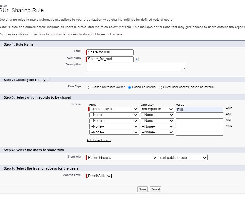 Option 2: Create a sharing rule to share all records of the object. You can use something as shown below, where the surl public group contains only the user you set up in STEP 2. Or you can share with Portal Roles and select the role of your user. Use criteria that is always true.
