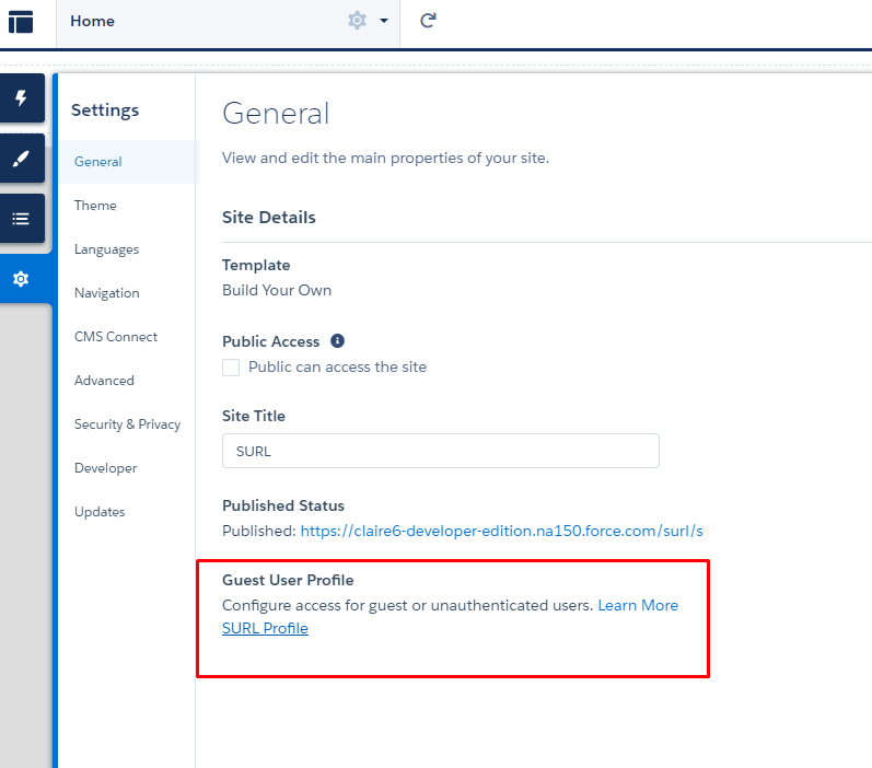 You can find your community url by going to setup>digital experiences>all sites to see the url you created in STEP 1. (e.g. https://cyangate-a-dev-ed.my.site.com/surl) If you have anything after the “.com”, it will automatically be removed. This is ok.Click Save