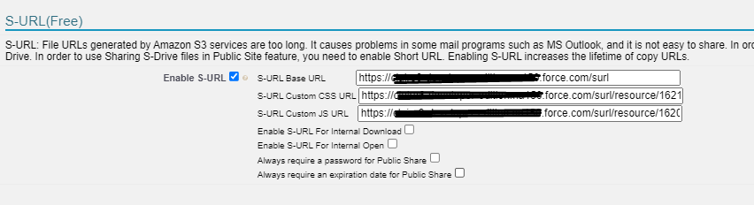 This page explains how to set up S-Drive so that short url links (S-URL or surl) can be used. S-URL is needed in order to create public share links to share files with users outside of Salesforce. S-URL can also be used to open and download files internally in Salesforce if desired.