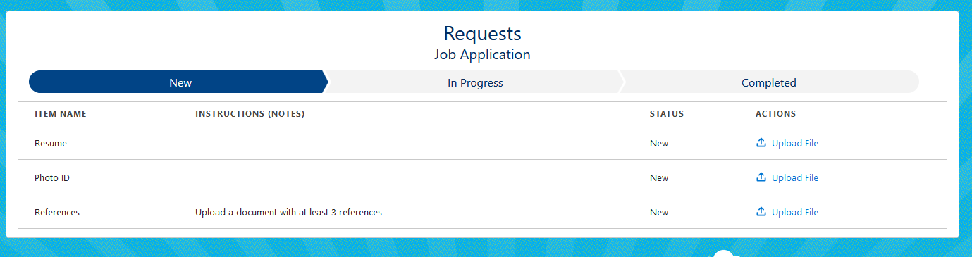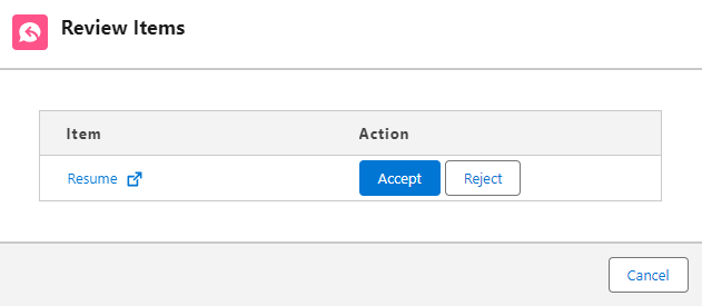 Once files are uploaded, the Requestor in Salesforce can approve or reject the documents. This can be done even if not all the documents have been uploaded. The Requestor can click the Request as soon as there is progress, and will see each item listed. Items that have been submitted can be approved or rejected by clicking on the eye icon.