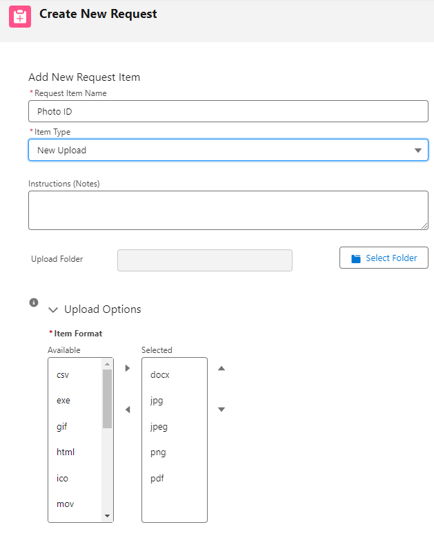 Item Format: Select the type of files that are acceptable to upload. This option is only for Item Type of New Upload