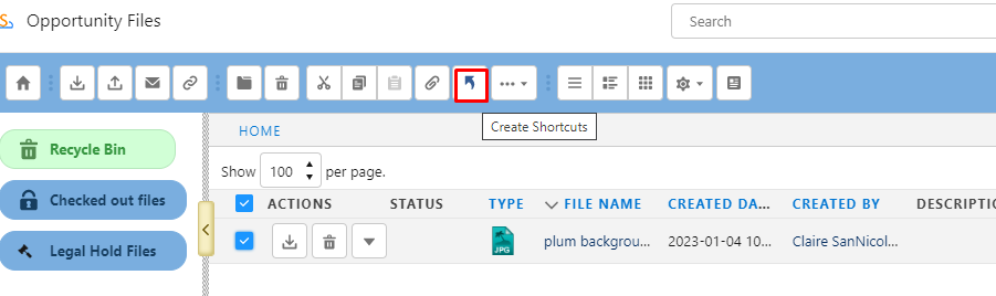 To create a shortcut, select a file or files and click the shortcut icon on the toolbar.