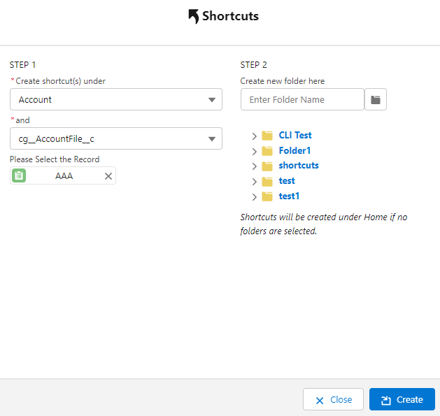 Choose the Object, file object, and record. You may choose a folder for the shortcut to go in, create a new folder, or put the shortcut at the root level.