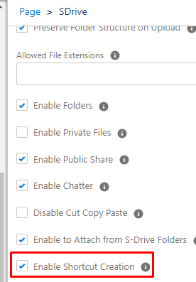 The Enable Shortcut Creation checkbox must be checked on the S-Drive Lightning component configuration.