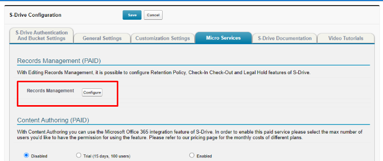 S-Drive Configuration Page and some sub-pages (Preview and Thumbnail Configuration, Bucket Folder Configuration) will load faster. Records Management is now on a separate sub-page.