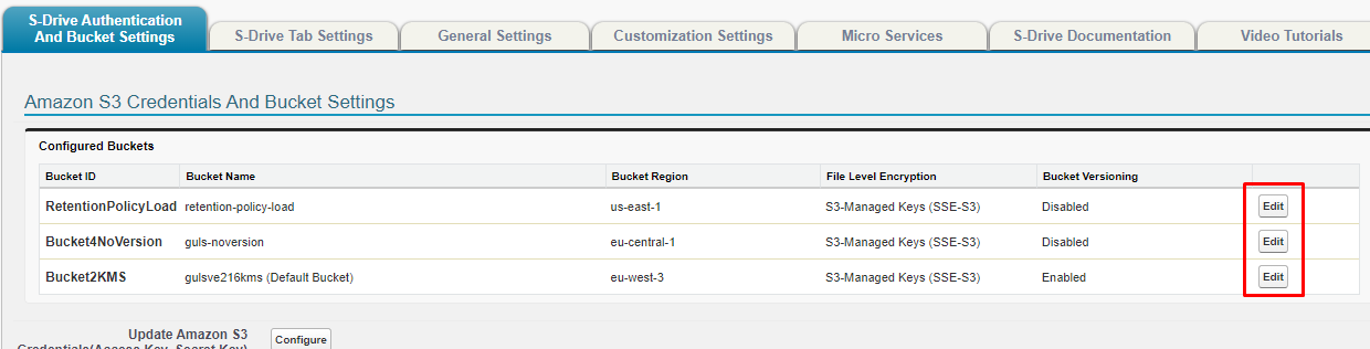In S-Drive Configuration, click the Configure button next to Update Storage Service Credentials(Access Key, Secret Key) and Bucket Configurations.